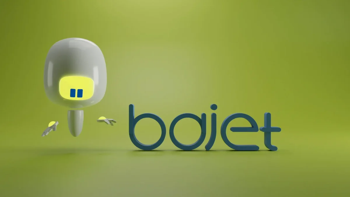 Playful 3D mascot reveal for BAJET—robot enters, bumps into the 3D logotype, reacts with charm, waves to the audience. Blender + FL Studio.- Client